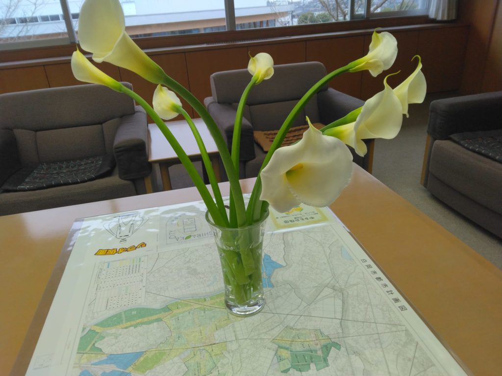市役所ロビーが一段と華やかにバージョンアップされて市民の皆様を迎えてくれています。お蔭様で市長室も華やぎました。