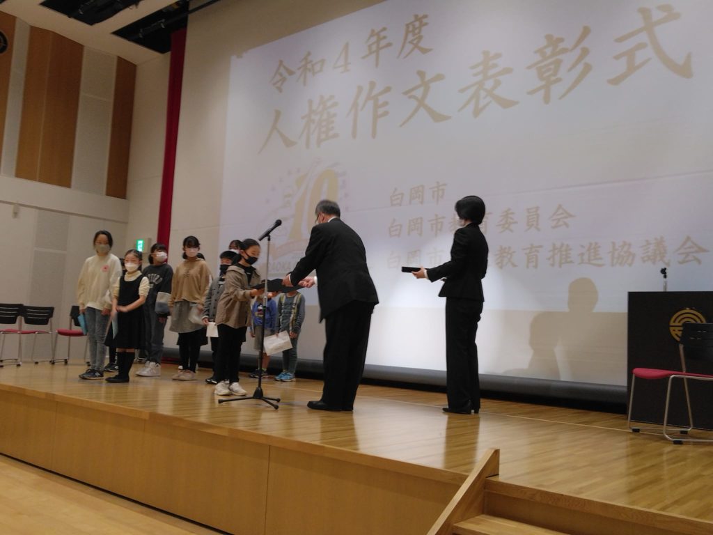 作文では人権について良く理解した内容で、人権は「一人一人の個性を大切に自分らしく生きること」や人権は「誰かの問題ではなく自分の問題として捉え互いの人権を尊重すること」等発表され、確りと人権を認識している姿に感心しきりの発表でした。