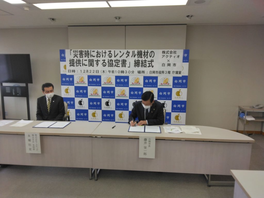 災害時におけるレンタル機材の提供に関する協定を㈱アクティオ様と締結いたしました。