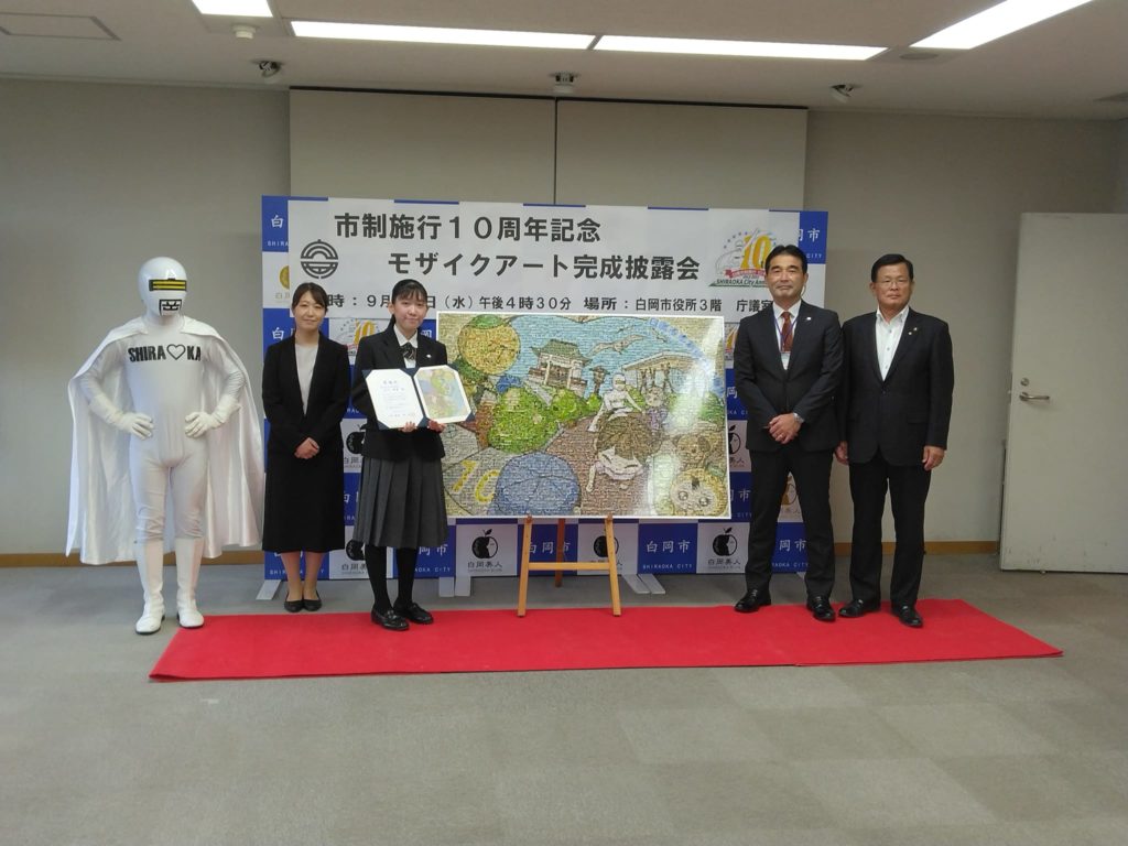 今回の記念事業は白岡高校美術部小川さんに原画を制作して頂き、市内の6小学校全児童約2,600名の協力で約5,000枚の写真を提供していただき、並び替えてモザイクアートとしたものです。