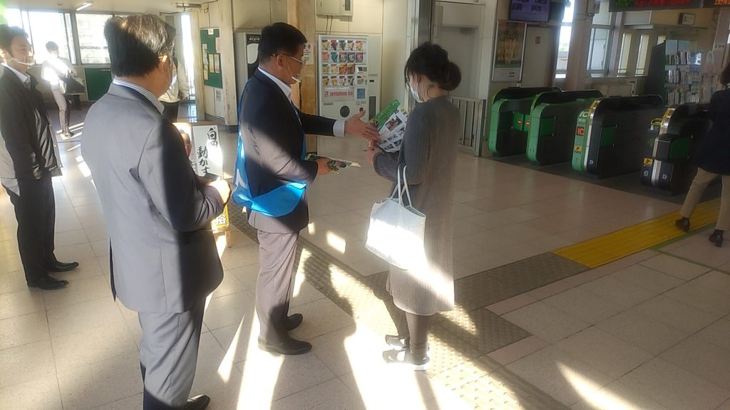 朝、駅頭で街づくりに熱心な御婦人と意見交換。